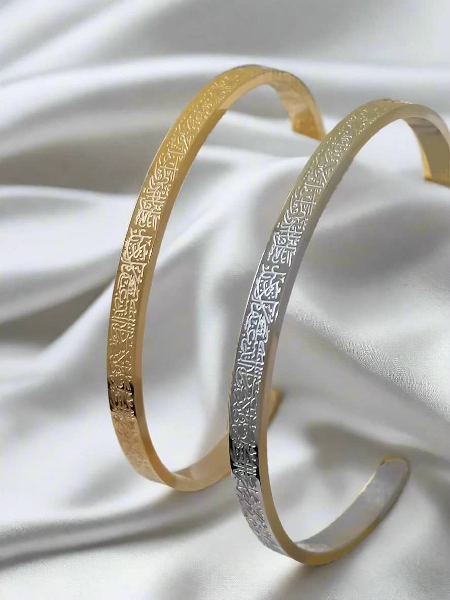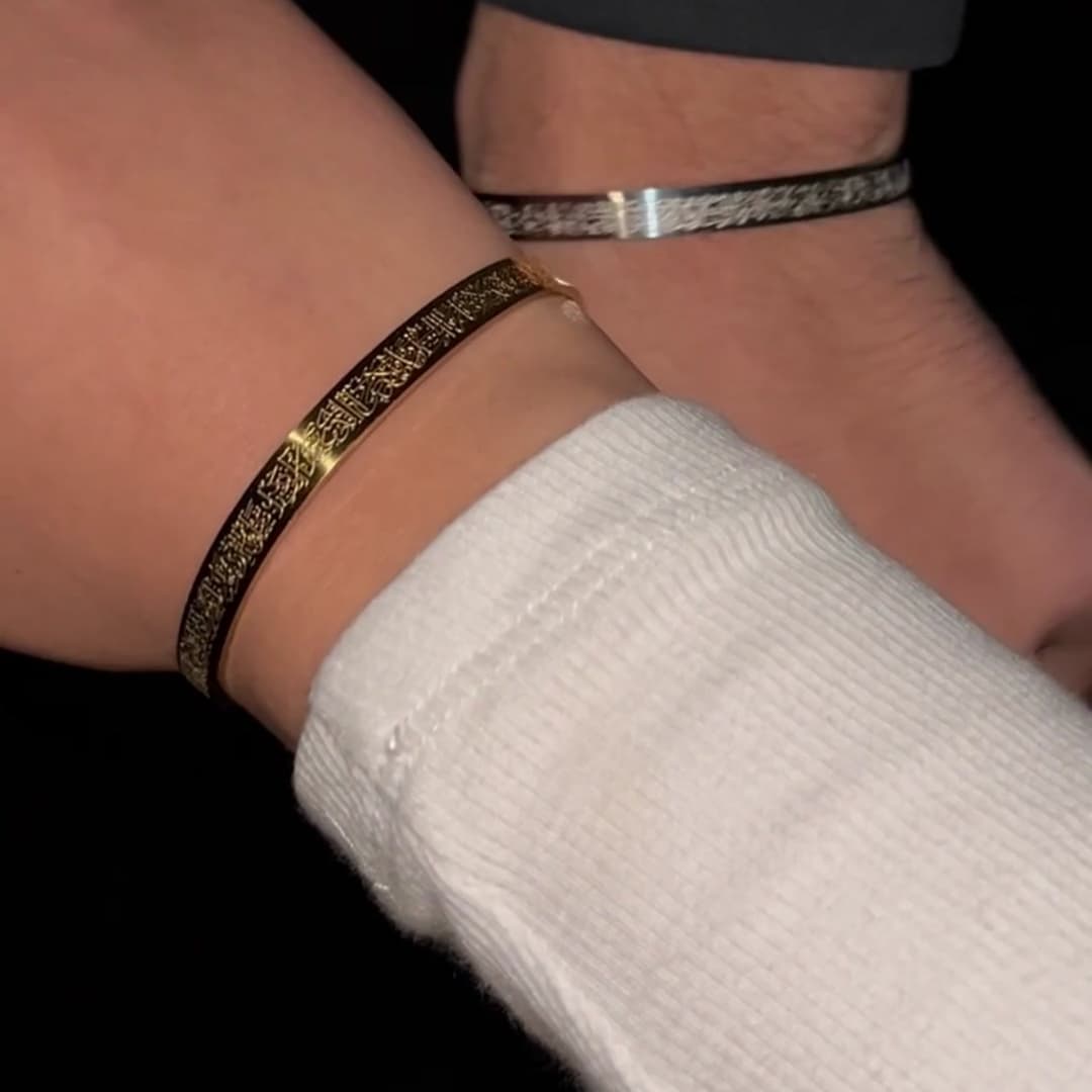 قطعتان… معنى واحد. طقم سوارين منقوشين بآية الكرسي بتصميم مينيمال راقٍ، يليق باللبس اليومي ويُهدى كرسالة محبة ودعاء.